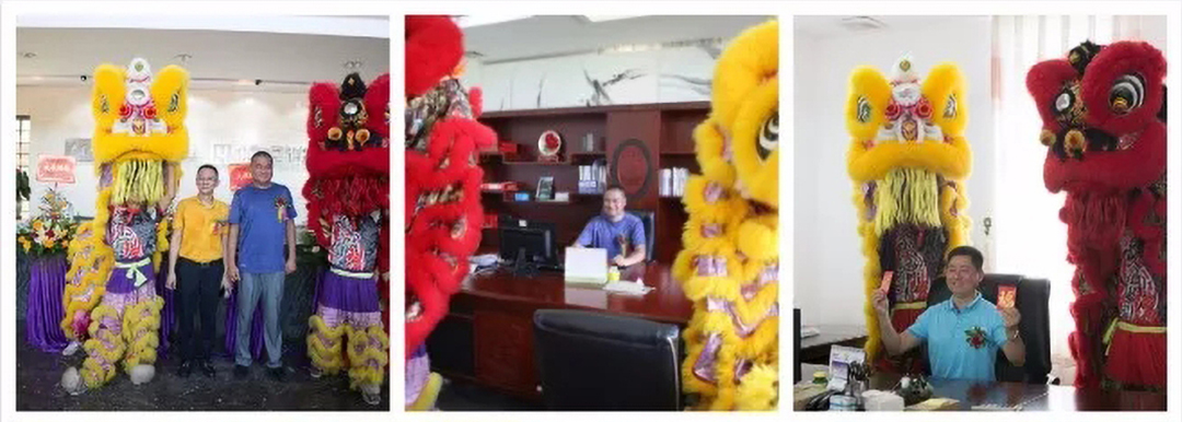 公司邀請到廣東頂尖的“佛山黃飛鴻舞獅隊”帶來吉慶的表演,或左右騰挪,或上下翻舞,金獅生靈活現(xiàn),朝氣喜人;板凳和高桿表演更是引人入勝,采青、接青,祝福從天而降,寓意海納百川!財源廣進(jìn)!
