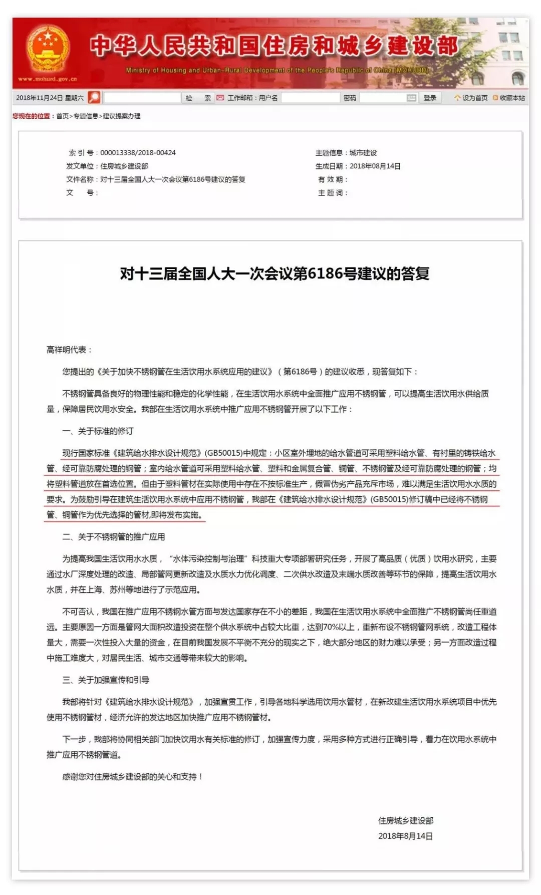 全國人大代表、太鋼集團(tuán)董事長、黨委書記、總經(jīng)理高祥明作為不銹鋼行業(yè)領(lǐng)軍企業(yè)的老總,同時也是全國人大代表,認(rèn)真履行職責(zé),詳細(xì)調(diào)查分析了我國城市生活飲用水管網(wǎng)狀況,并分析比較國內(nèi)外生活飲用水管網(wǎng)現(xiàn)狀。