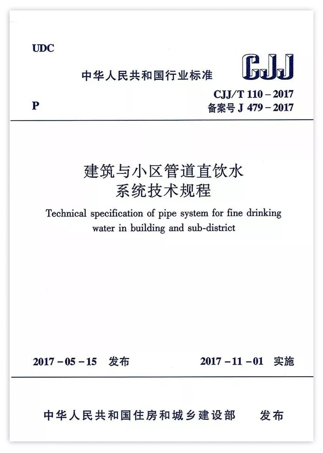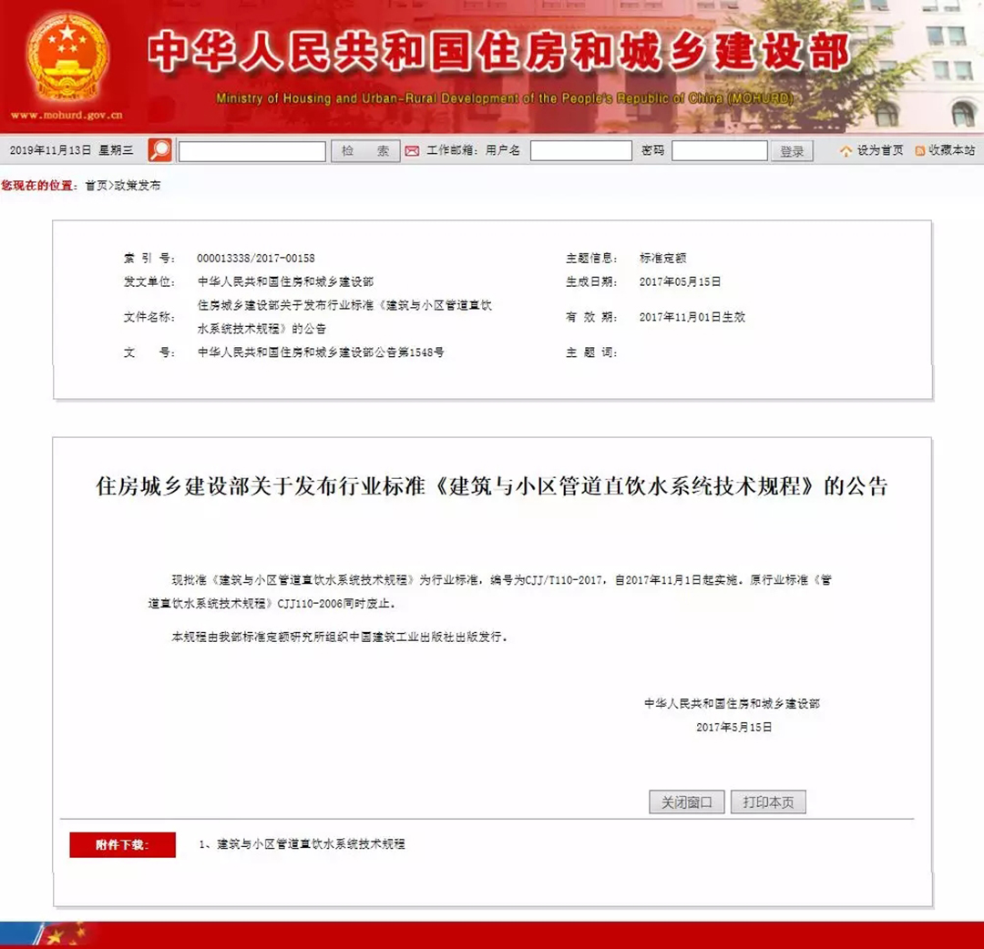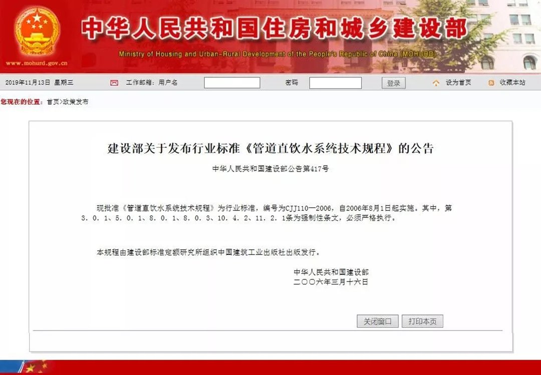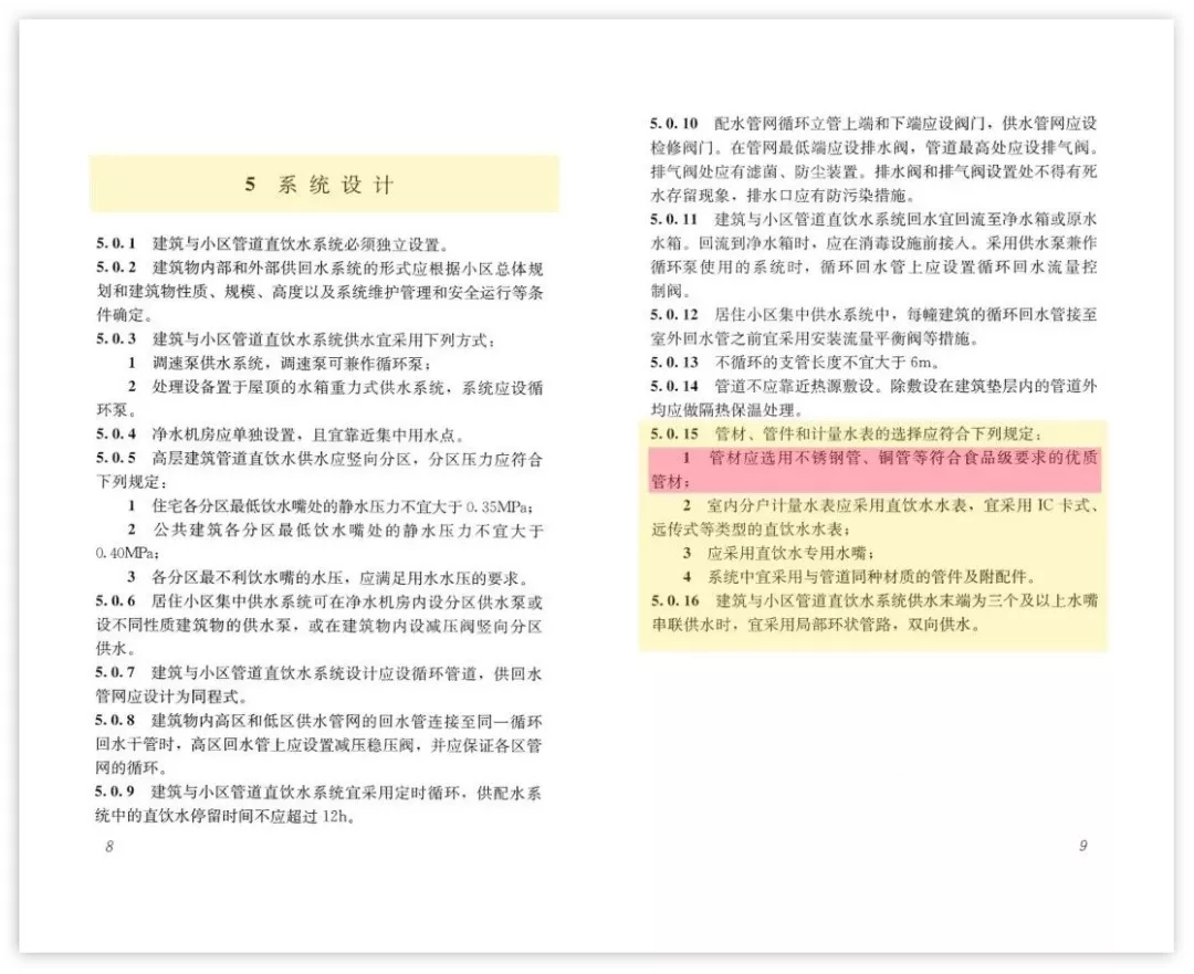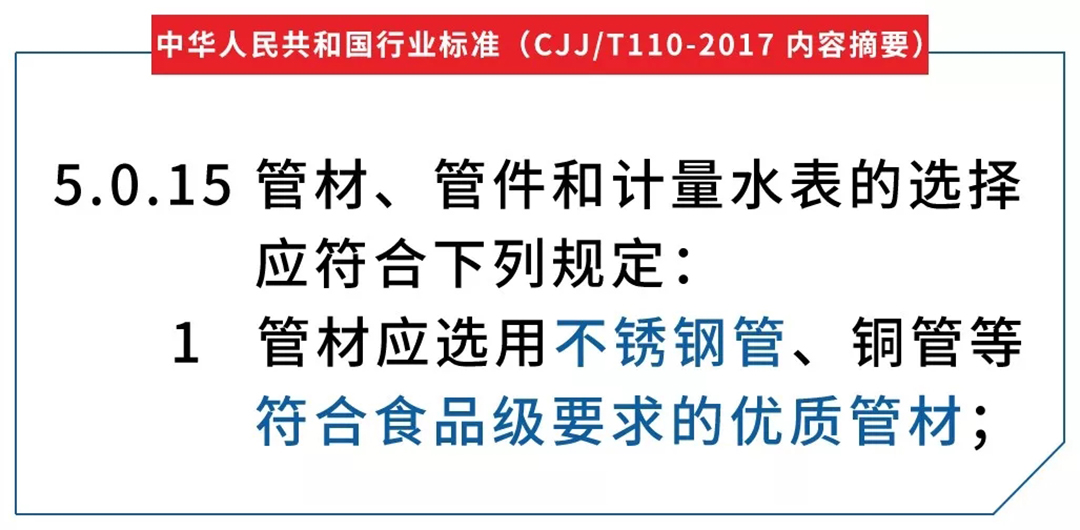 接著,住房城鄉(xiāng)建設(shè)部于2017年5月15日發(fā)布《建筑與小區(qū)管道直飲水系統(tǒng)技術(shù)規(guī)程》(編號:CJJ/T110-2017),自2017年11月1日起實施。原行業(yè)標(biāo)準(zhǔn)《管道直飲水系統(tǒng)技術(shù)規(guī)程》(CJJ110-2006)同時廢止。該規(guī)程十分明確地規(guī)定:“管材應(yīng)選用不銹鋼管、銅管等符合食品級要求的優(yōu)質(zhì)管材”。