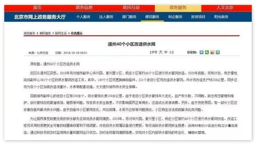 根據(jù)市發(fā)改委的批復(fù)書,2020年底前,城市副中心361個小區(qū)將完成供水管網(wǎng)的改造。其中,140個小區(qū)將置換掉自備井,221個老舊小區(qū)將改造供水管網(wǎng)。此次供水管網(wǎng)改造,共計將改造支戶線206公里,同步還將為各個小區(qū)加裝改造流量計、水表等配套設(shè)施。